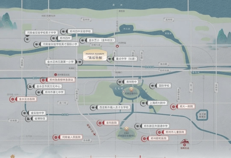 2、自然资源得天独厚,坐拥“五河六园”。项目周围“六园环绕”,分别为市政规划1号公园、2号公园、科教公园、大河遗址公园、贾鲁河公园、北龙湖湿地公园。“五河”北边万亩黄河、索须河、贾鲁河,南边魏河,北龙湖。