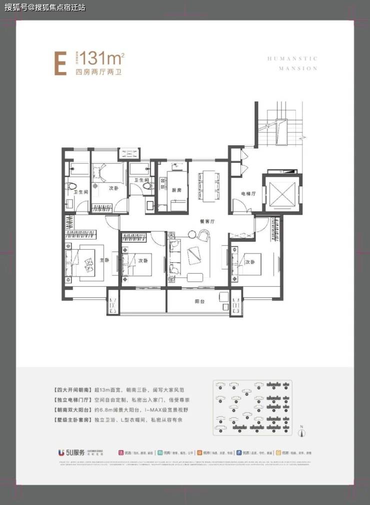 双开门电梯,约10㎡独立电梯门厅;得房率约81%;四开间朝南,南向面宽超13米;南向双联阳台面宽约6.8米;扬州人热爱的飞机户型,减少客卧/老人房与主卧起居干扰;主卧套间设计,生活品质感更好。