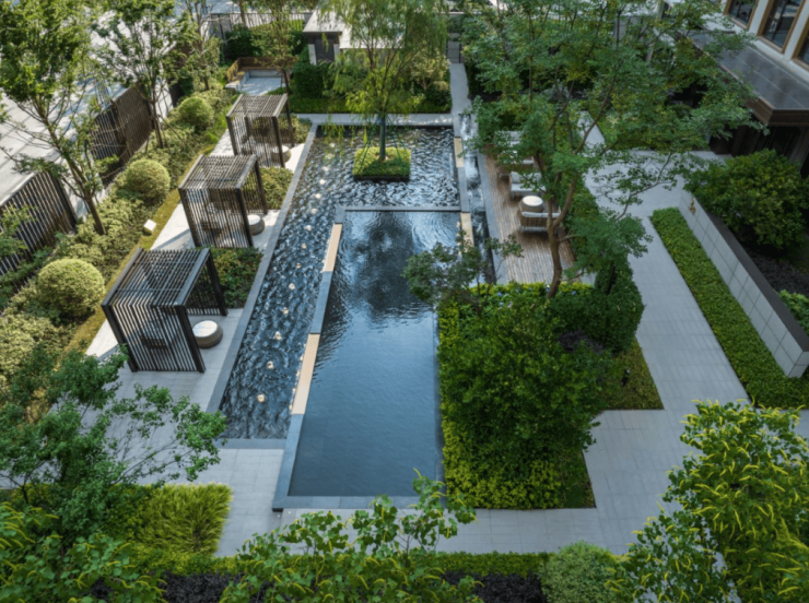 不仅如此,“三庭四院”的围合式园区,水景、小型喷泉玲珑精致,还做出了供人休憩的林下空间和露天会客区。