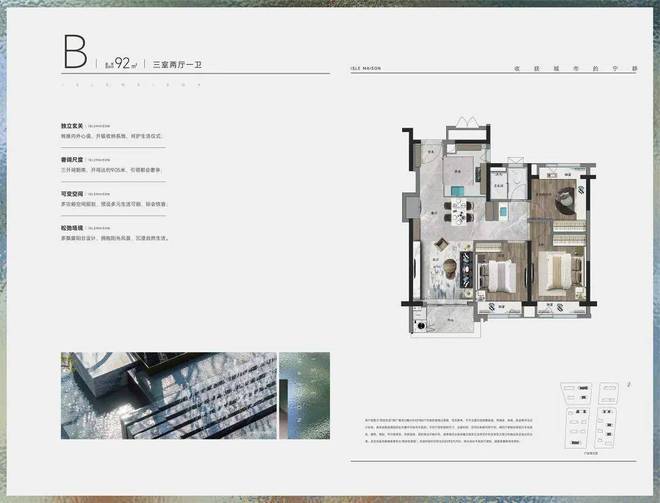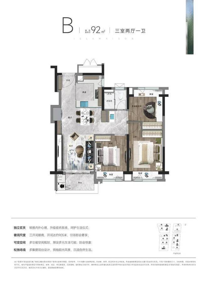 建面约92㎡的3房B户型,整体三开间朝南,3卧室2飘窗1阳台,并且室内没有过多的转角和过道浪费空间,所以不管是采光、视野、通风还是尺度感都可圈可点。