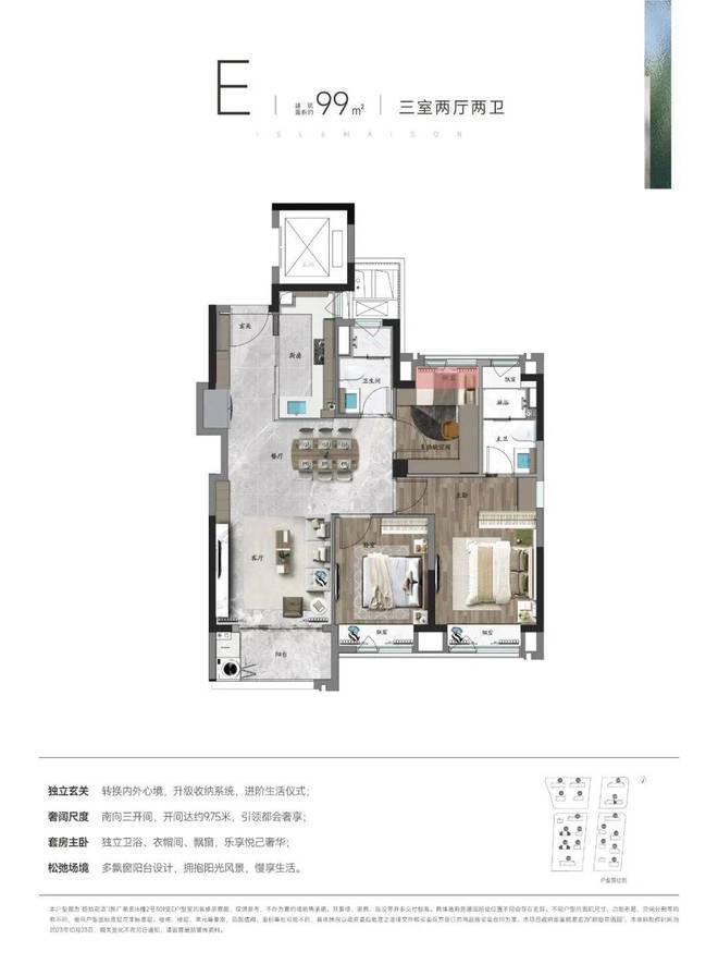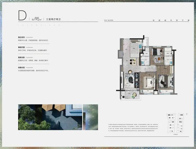建面约95㎡3房2卫三开间朝南,整体的南向尺度感非常出色。