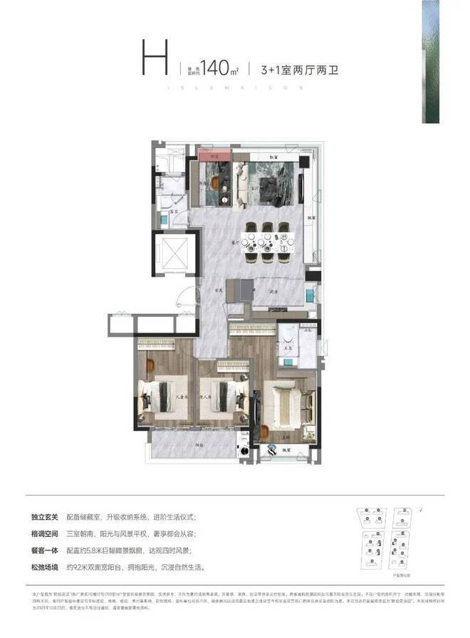 约140㎡3+1房,拥有一个约270度的转角厅,视野出众。
