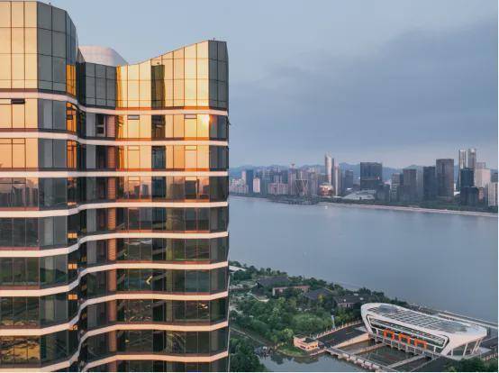 建筑以杭州市花—桂花花瓣为造型灵感,四瓣依次展开,以同频世界审美的曲线立面,融合鎏金玻璃幕墙,让建筑在钱塘江畔熠熠生辉,构建脱颖而出的世纪城新地标。