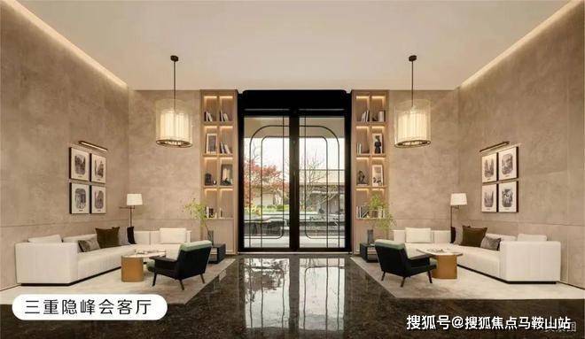 三重隐峰会客厅,打造约170㎡归家大堂,会客厅引入天然采光井,墙面为那玻力灰石材,地面为水刀切的海派拼花纹路,同时贴心设计了适合阅读的氛围,未来,这里可以是业主待客的场所,可短暂的停留,更可自在的休憩。