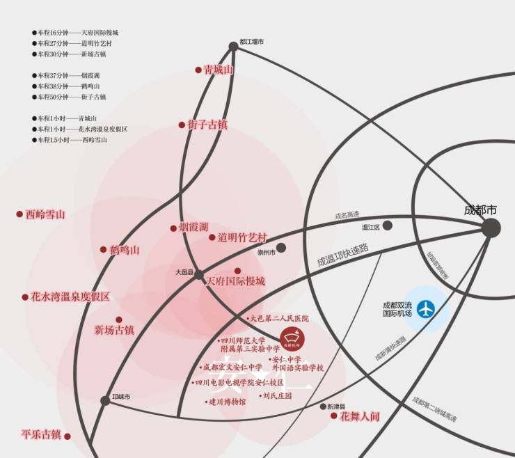 安仁古镇、刘氏庄园、建川博物馆群落、锦绣安仁花卉公园、今时今日安仁剧场、南岸美村乡村会客厅、林盘乡舍、天府慢城、西岭雪山、道源圣城……