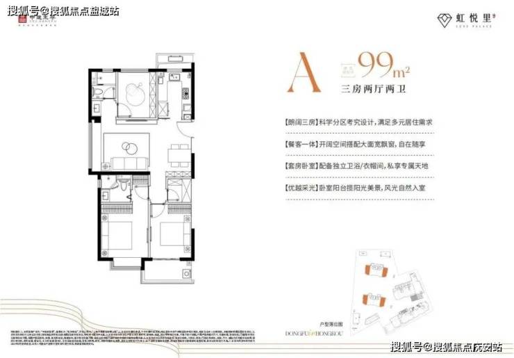 建面约99㎡A户型:这是一个边套观景户型,客厅衔接大飘窗,景观视野出众。