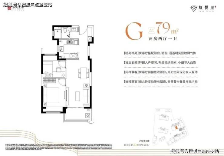 建面约79㎡2房G户型:该户型进门后配有玄关,让出入皆有生活仪式感,同时便于收纳随身物件。