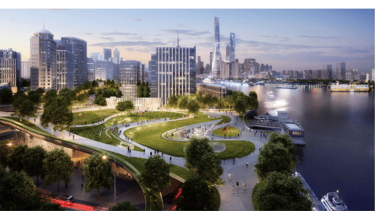 这里与外滩世界级滨水区无缝相连,绿地外滩中心-董家渡景观花桥建设,使外滩景观带拥有了一座包括地下、地面、空中的“立体交通”公共廊道。