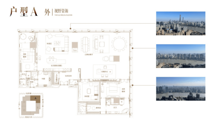 天际视野,价值“峰景”, 穹顶社交、栖心平台。天幕行宫以中心“峰景”视野俯瞰着城市的价值繁盛。北视角:陆家嘴、北外滩;西视角:人民广场、新天地;东视角:浦东、黄浦江;南视角:南浦大桥、世博园。