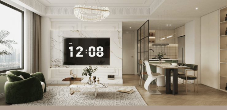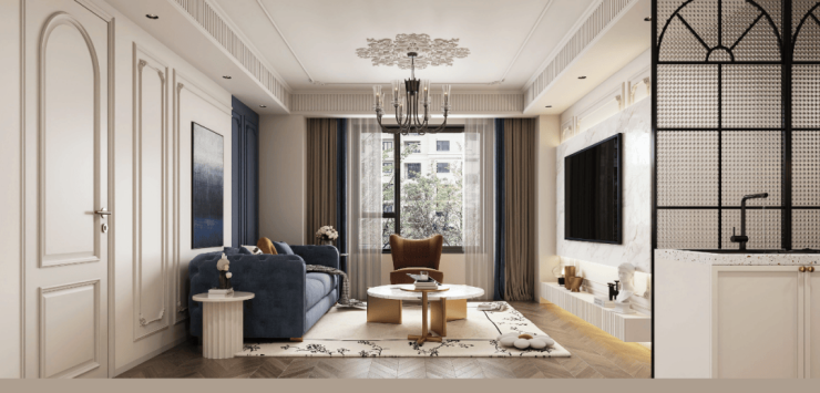 软装升级:入户门高端定制、反射灯带隐形线型风口,墙面更新为皮革硬包搭配木饰面,沙发背景以烤漆板替换墙幕,细节处洞见生活质感。