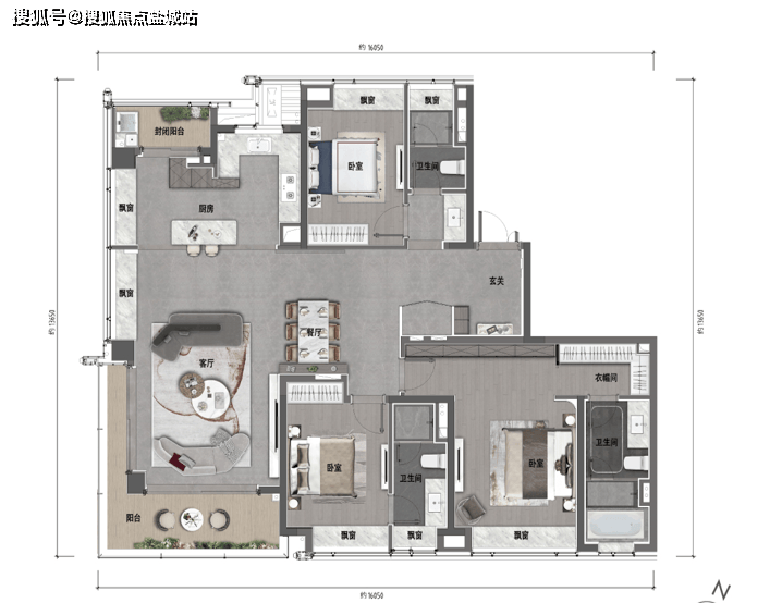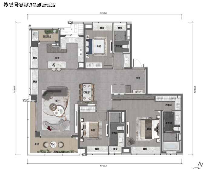 三开间朝南,南北通透,270°转角大阳台,南北双阳台,主卧是带步入式大衣帽间和可放浴缸的卫生间的大套间,动静分区十分合理,多飘窗和大阳台使得实际得房率很高。