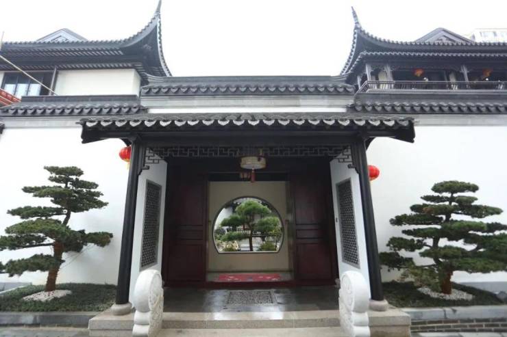 院落采用歇山、硬山与小披檐等古典建筑手法,丰富了建筑的造型与空间层次。外立面精选浅色石材为主材,屋面则覆盖深色日式合瓦,搭配深色金属构件,完美勾勒出粉墙黛瓦的中式意境,使色彩构成既冷暖交织又时尚精致、典雅简约。