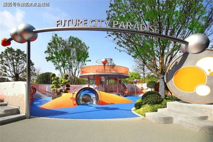 从外部路过,无法窥见绿岛全貌,只能听到里面孩子们的笑声和流水声。拾级而上,绿岛的隐匿感瞬间化为豁然开朗:度假风凉亭、躺椅、不规则水池交错其间,配以四季轮转的20余种植被——春有晚樱、夏有广玉兰、秋有金桂、冬有红梅。