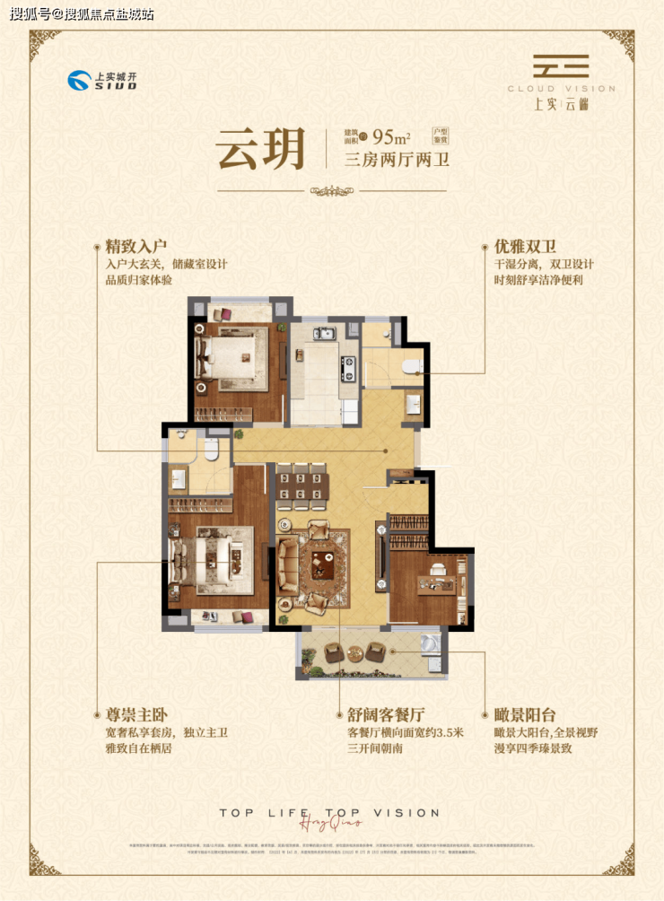 约95㎡三房两厅两卫,做到了三开间朝南+瞰景大阳台+主卧套房设计+南北通透+卫生间干湿分离,该户型得房率和空间利用率都非常高。