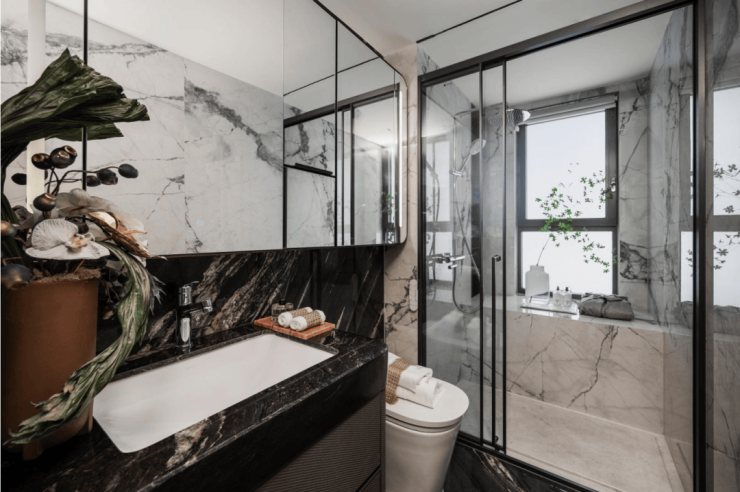卫浴墙面采用寒江雪大瓷砖铺装,淋浴部分地面选用整块天然大理石。