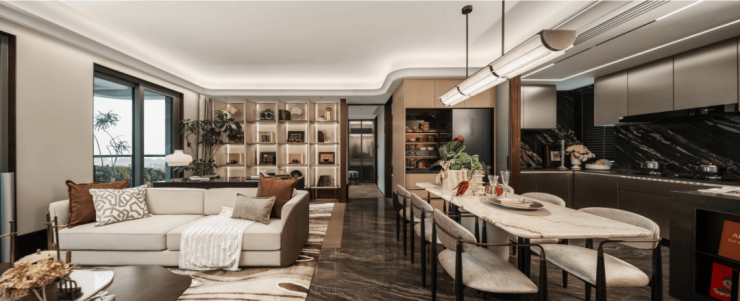 翎翠滨江通过大量的奢石、隐藏式细节将整个室内打造成了艺术的殿堂。