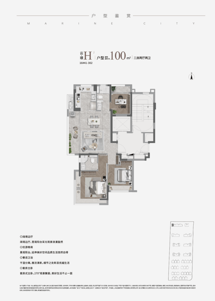 部分约100-101㎡H边厅户型,全景阳台搭配主卧L型转角大飘窗,三面采光+270°环幕视野,景观面堪比豪宅尺度。