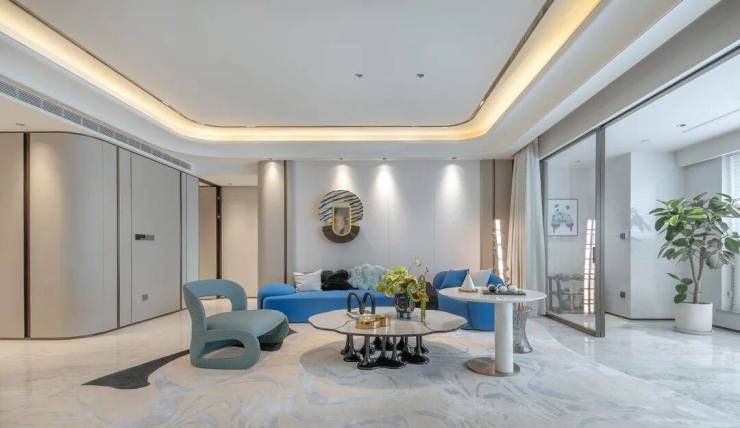 地面竟然是用鱼肚灰和东方鱼肚白做的圆弧形拼花,像层层翻涌的云朵梦想。雪山蓝的岛台(琚宾311㎡样板间),墨色的晶体泛着珍珠般的光泽,像一幅雪景中繁花盛开的水墨,圣洁中带着优雅。还有芬迪白、南斯拉夫白、直纹白玉、卡里冰玉等众多进口奢石,仿佛走入了世界顶级的石材陈列展示馆,品质感、价值感不言而喻。