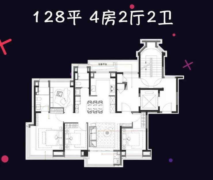 128平的4房2卫,四开间朝南的设计,整体看下来每个卧室都不小,尤其是主卧面宽达到约4米,足够做出一个小衣帽间,并配置270度转角飘窗,总价预计在700万起步。