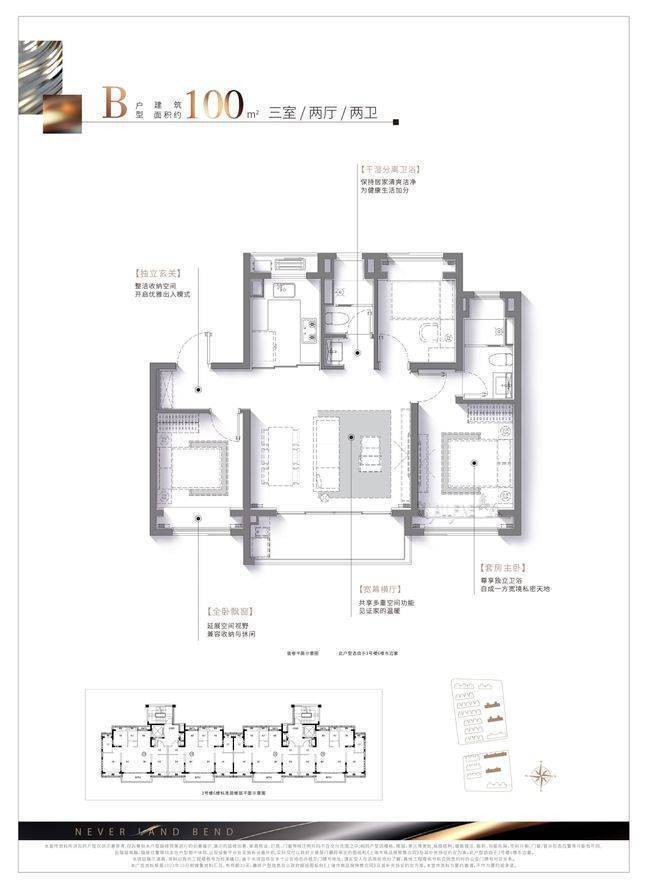建面约100㎡的三房两厅两卫户型,可以说是约96㎡3房的升级版,空间更加延展,整体横厅面宽约5.2米(轴中距),形成更大的南向采光面,且搭配南向观景阳台,直接做到了3.5面宽朝南,这在同类产品中是比较少见的。