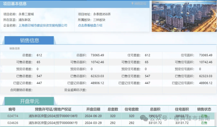 网上房地产官宣信息公示,项目一期去年3月以及6月先后两次开盘,总共612套房源剩余65套可售。数据面上看销售还是非常不错的。另外『永泰三里城』二期也在7-8🈷️份会入市