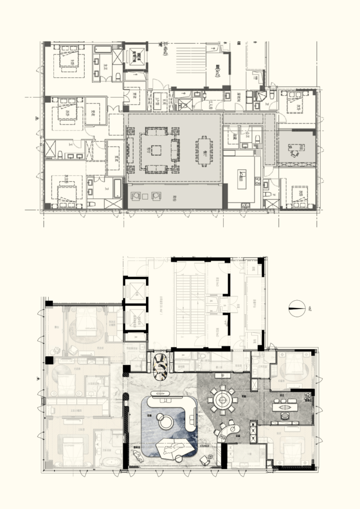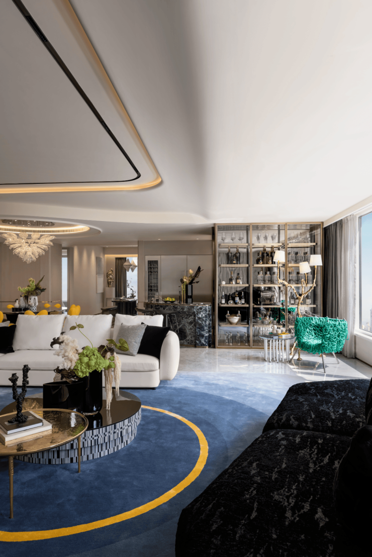 约300㎡“观湖”,谢柯打造;另一款是更宽舒的约412㎡“行云”,出自邱德光。尤其是约412㎡“行云”,无论玄关处雪花白、劳伦黑金、金世纪的大胆拼花,瓦楞式的波浪形电视背景墙,还是吸睛的普拉达绿石材吧台,全屋随处可见出色审美和奢华材质的完美结合。