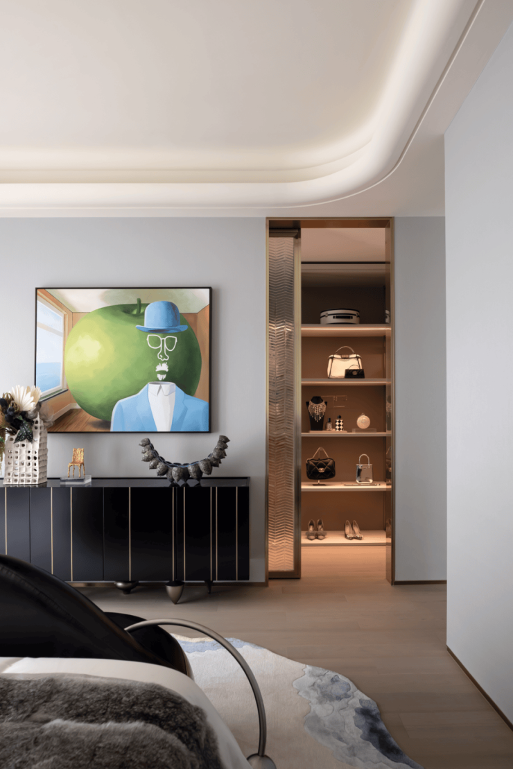 比较开放空间的不同因地制宜,在原始建筑平面基础上,我们采用「化整为零」的空间处理法,将阳台纳入室内,扩大原有公区面积,释放空间边界,打破动线区隔,形成一体化的“双客厅”概念。客厅、餐厅、LOUNGE、中西厨、艺术品整体呈开放式布局,公区空间大气灵动。