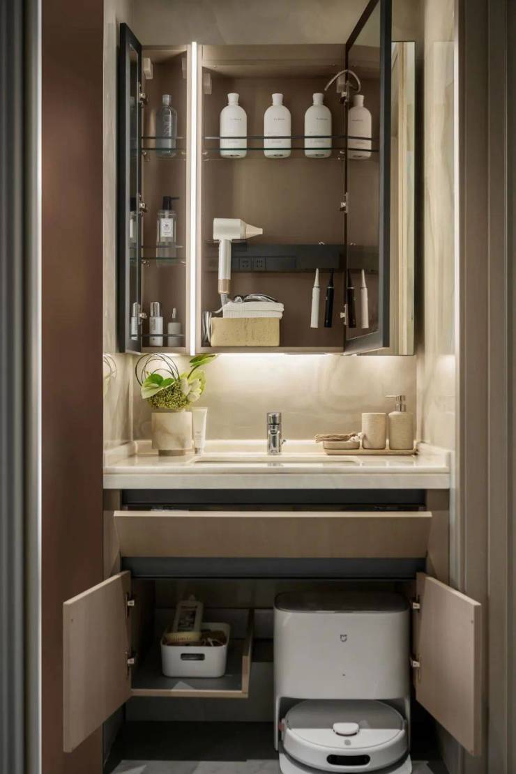 卫生间镜柜与预留洗地机位的台下柜,售楼处电话:400-000-0460转6666方便清洁用品的收纳,创造独立的家政清洁收纳空间。内嵌LED灯带的防雾镜柜,方便沐浴后的护理与美肤。