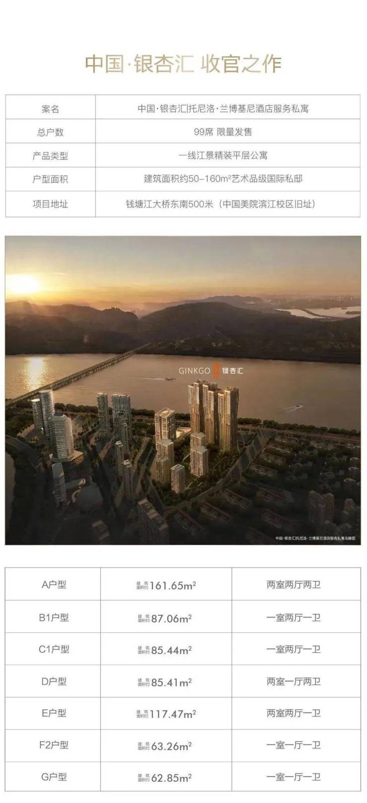 杭州银杏汇,类型:酒店式公寓,产权:40年,地铁:杭州地铁4号线(联庄站600米),总户数:首开90席,户型:平层公馆、4+1梯13户,层高:3.6米价格:预计5万,面积:50-80-120-160方(5-12层),精装交付7000元/方(硬装),交付时间:2021年中旬,物业:兰博基尼酒店管理服务(8.8元含能耗)