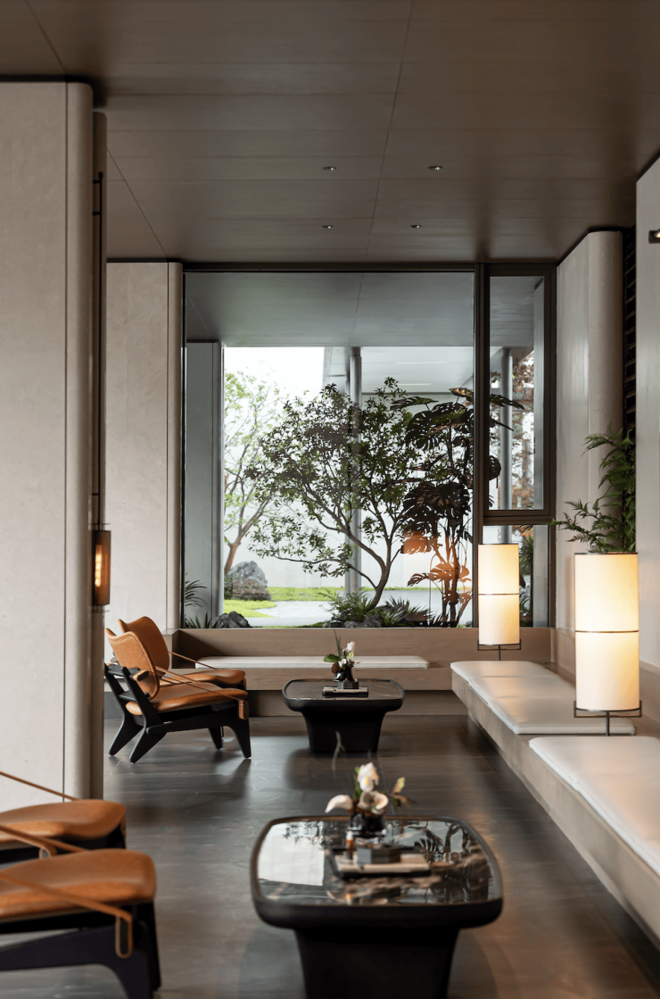可以是一片松林,可以是一座枫园,以植物的优美,打造景观的高级感,为其一;入境某处空间,或许是归家第一眼,或许某一个漂浮会所内的目之所及,为空间平添大自然的情境,为其二;当然还有某处灵动的潺潺流水、又或是平静如许的镜水等等,无一不是与环境美妙契合,成为风景诗意的一部分。