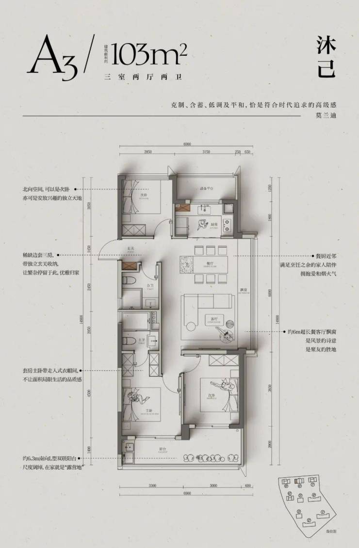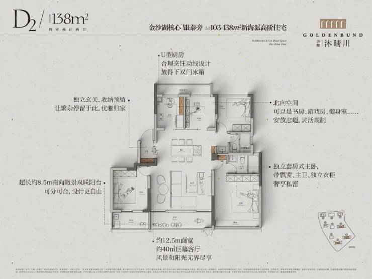 U型厨房设计,南向瞰景L型双联阳台,休闲空间更奢阔;北向空间,可以是书房、游戏房、健身室......安放志趣,灵活规制;独立套房式主卧,带飘窗、主卫、独立衣柜,奢享私密。