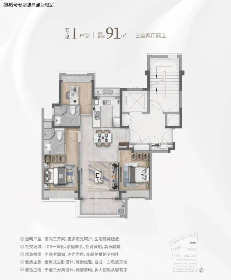 市面上90㎡左右户型两房居多,华发海上都荟建面约91㎡直接3房一步到位,并且有2卫配置,主卧进阶套房,功能性远超同价位竞品!