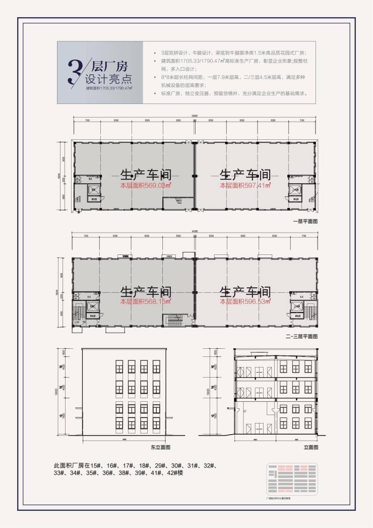 三层厂房:一层高7.9米,二层、三层高4.5米,预留牛腿,可安装 5t 电动单梁吊车