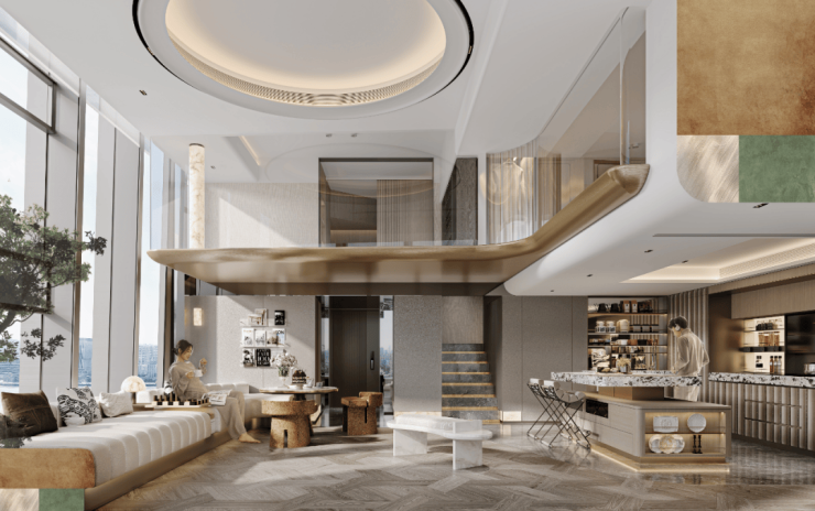 约4.2米的从容层高,赋予空间呼吸感与仪式感;流动的曲线语言,从立面延展至天花,勾勒出柔和且富有张力的场域轮廓;灵活可变的场景模块,则回应着居者动态的生活剧本。这一切,不止是形态的塑造,更是情绪的引导——光、空气与人在此自由交互,国际化美学被巧妙转译为日常的诗意。