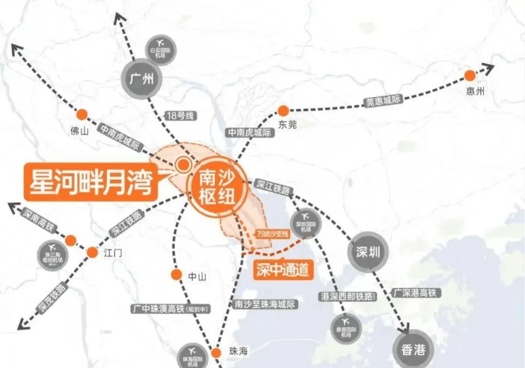 靠近南沙枢纽站TOD:建设14站、30线轨道高铁站,站台规模仅次广州南站(15站28线),真正成为湾区交通枢纽中心。