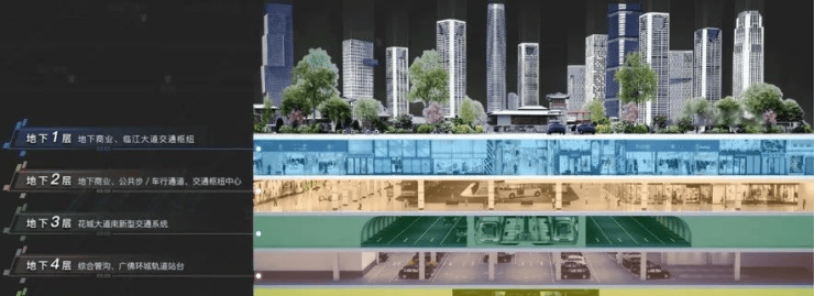 地下五层六轨:213万方地下五层空间,集交通、商业于一体