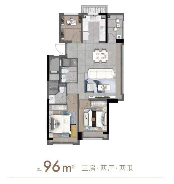 「建面约96㎡3房2厅2卫」