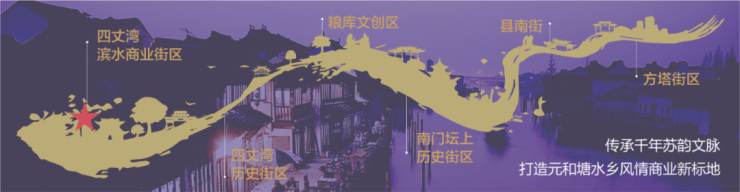 项目所在的元和塘——永济桥节点,向北沿元和塘河流连通常熟老粮库文创园区、南门坛上历史文化街区、护城河等核心景观,以吴文化为纽带,元和塘为载体精心打造,形成文化、商业、旅游资源的大贯穿。