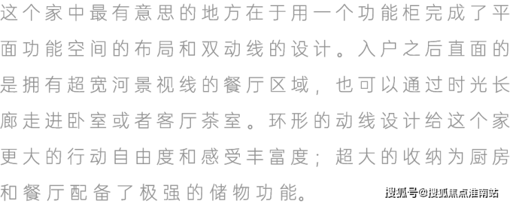 方案三易其稿,410平米的空间最终敲定的平面里只保留了两个卧室,但他们并没有把大量的空间留个客厅,而是将其均衡地分配给厨房、餐厅、茶室、卧室等生活的功能空间以及储物的空间。