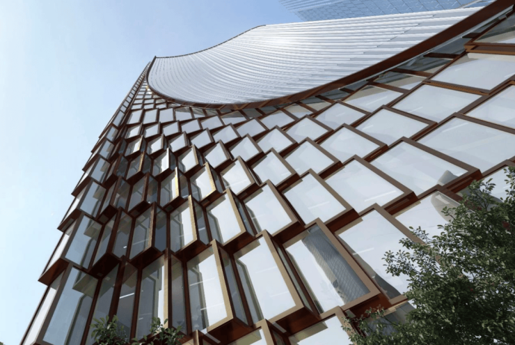 外立面是 UNStudio做的龙鳞幕墙和杭州裙摆,钱江新城来福士广场也是UN 设计的,未来钱塘江两岸遥相辉映。杭州裙摆将大平层、安达仕酒店和自持超甲级写字楼连成一体,T1和 T2通过高差,在裙摆下形成了围合住区,这种室内外交融的灰空间,是杭州独特的国际化体验。