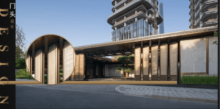 地下车库采用全铝板吊顶、环氧金磨石地面,配备环岛落客区、仿天光照明、司机休息室等设施,提供酒店式归家体验。入口门廊设计古松相迎,光影交织,营造隐奢氛围。