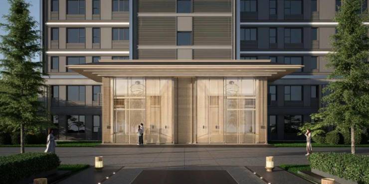 一重门·社区门:抽取蠡园大门之形,延袭东方传统三间门户格局,以现代潮流极简线条和金属材质,门头“官帽”设计,呈现具有当代中式韵味的大门