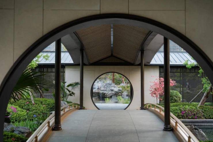 二重门·景观门:月洞框景,复刻寄畅园内的月洞门,携手名匠就其尺寸大小、色彩用材等进行细腻设计,形成隔景、框景之雅趣