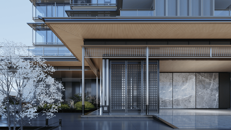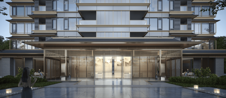 入户大堂首层无住宅落地,留出空间与外部环境对望,沟通,互动,精巧而庄重的设计让踏足至此的宾客感受宋代特有的仪式感。基座保留“擗帘杆”独特的美学特点,用运用简洁的线条来表现其纤细精巧,更具流线型的美感。“挂落”垂于“重檐”之下,让立面层次更加丰富,彰显淡雅精致的宋式建筑韵味;格栅与立面的简洁线条结合,为建筑增添独特视觉效果。