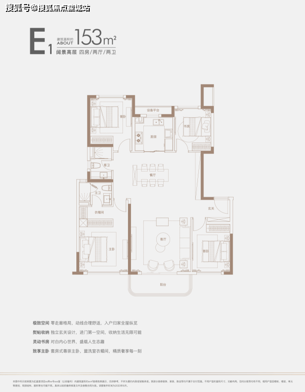 建面约140㎡四房:三开间朝南户型,南北通透,采光条件优质,客厅明亮宽敞,彰显大气布局。