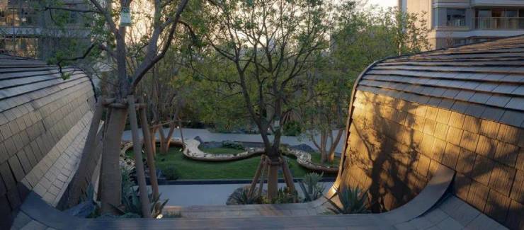 一个半下沉庭院将大门和邻里中心串联,这个“到达”-“步行”-“停留”-“体验”的序列,就是展现向往生活的物理载体。这个几千平方米的实景社区中庭空间,就是安放我们内心向往生活的栖息之处。