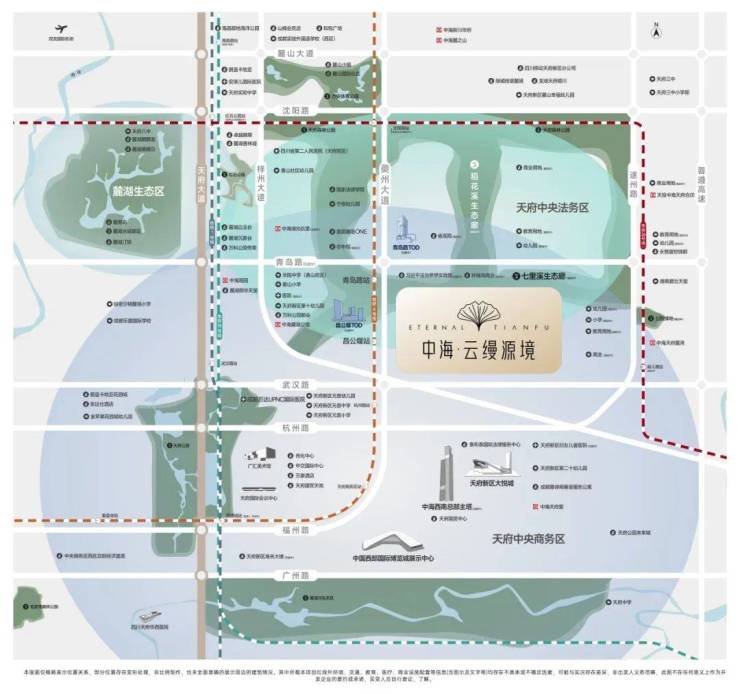 中海·云缦源境位于天府前湾的两个TOD——青岛路TOD和昌公堰TOD之间,特别是青岛路TOD是板块核心,也是中央法务岛所在地;项目地块被大面积的公园绿地和低矮建筑360°环抱,整个小区就像一片公园中间的岛屿一样,不仅生态环境优越,外围房源的视野也会比较好。
