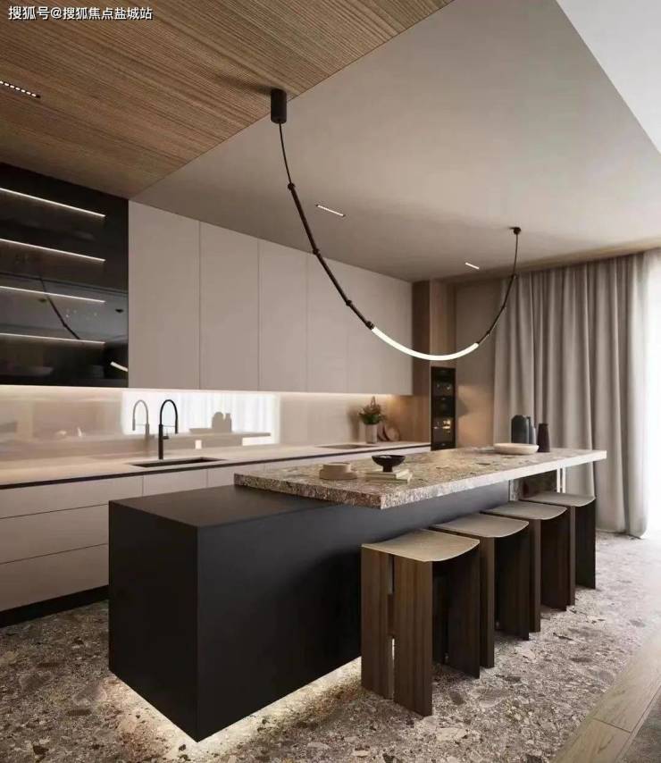 一层生活区围绕着客厅和餐厨功能打造。直面(建筑面积约91㎡)花园的整扇落地折叠玻璃窗,可自由打开,自在进出,达到与自然零阻隔。夏日乘凉喝茶,秋日围炉夜话,其乐融融。