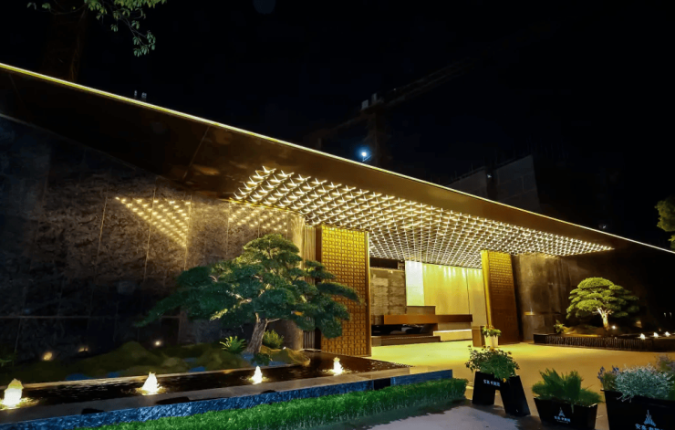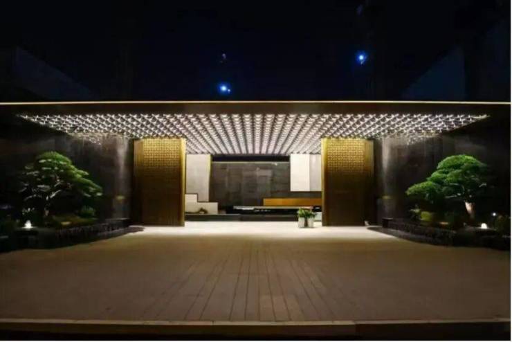 95米长的西大门长廊率先映入眼帘,乱纹黄古铜饰面与深色奢石大理石碰撞,顶部金属铝板立体切割,彰显归家仪式感!大门内侧,照壁以中国黑石材与青白石组合,延续空间礼序!