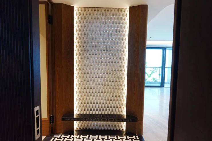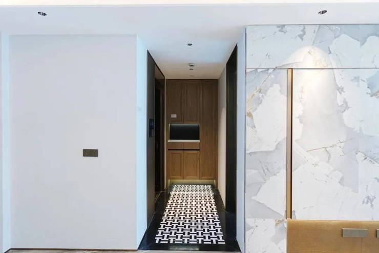 另一个样板间则是170㎡的,这个户型是电梯双开门的类一梯一户。开门以后映入眼帘的是陶瓷的编织纹玄关背景墙。